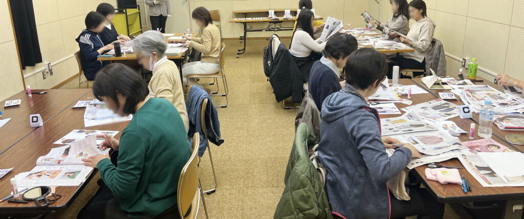 講座の後半は、雑誌の切り抜きを使って「自分に似合う色・好きなスタイリング」をコラージュするワークを行いました。